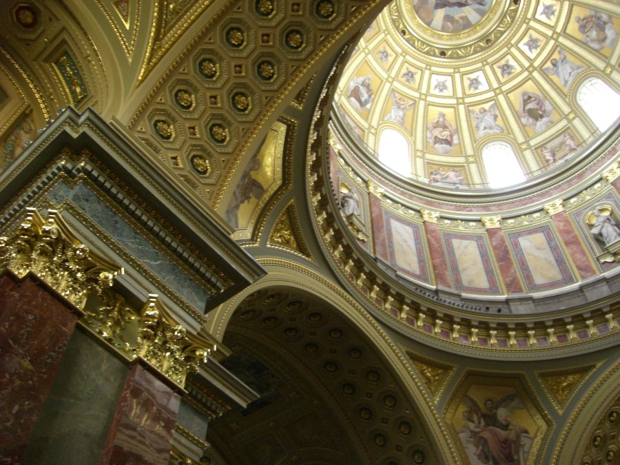 シナゴーグ シナゴーグはユダヤ教の教会で、ここはヨーロッパ最大のシナゴーグだそうだ。内部の 雰囲気はキリスト教の教会とそれほど変わらないが、彫像や十字架がなく、綺麗な幾何学 模様で飾られている。入る時に男性には黒い小さな帽子が渡され、頭にかぶるのだが、 髪に止めるものがないので、すぐ落ちてしまう。2階は博物館(宝物殿)になっていて、 宗教関係の宝物や戦争中の歴史写真などが展示されている。ブダペストには第二次世界の 時まで多くのユダヤ人知識人や貿易人がいて活躍していたが、戦争中に多くの人が殺され た。3階はハンガリーのユダヤ人の芸術(絵画)が展示されている。