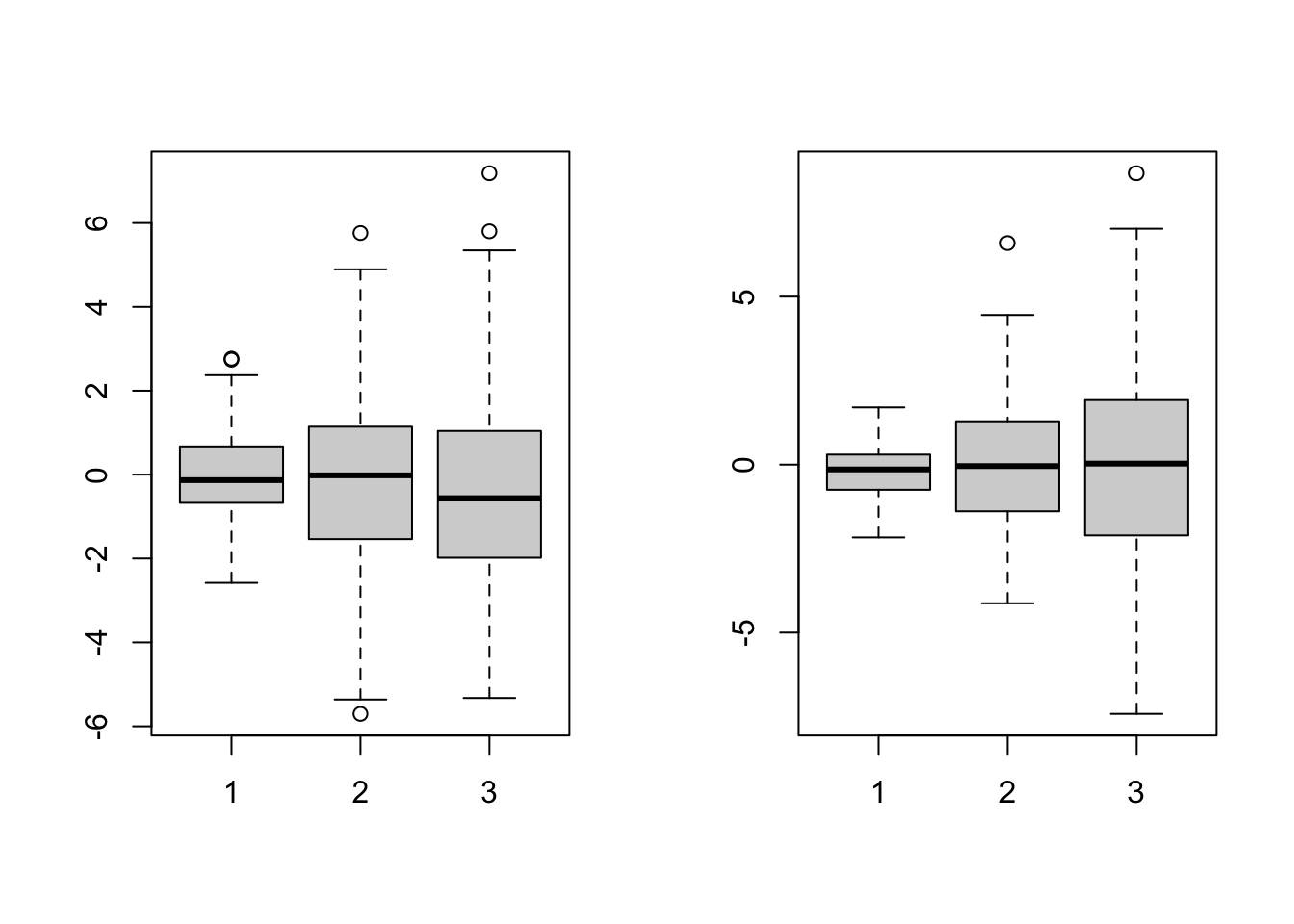 箱ひげ図を書いてみるのもひとつの手段.これはboxplot関数でできる.引数はベクトルでも行列でもどちらでもよい.