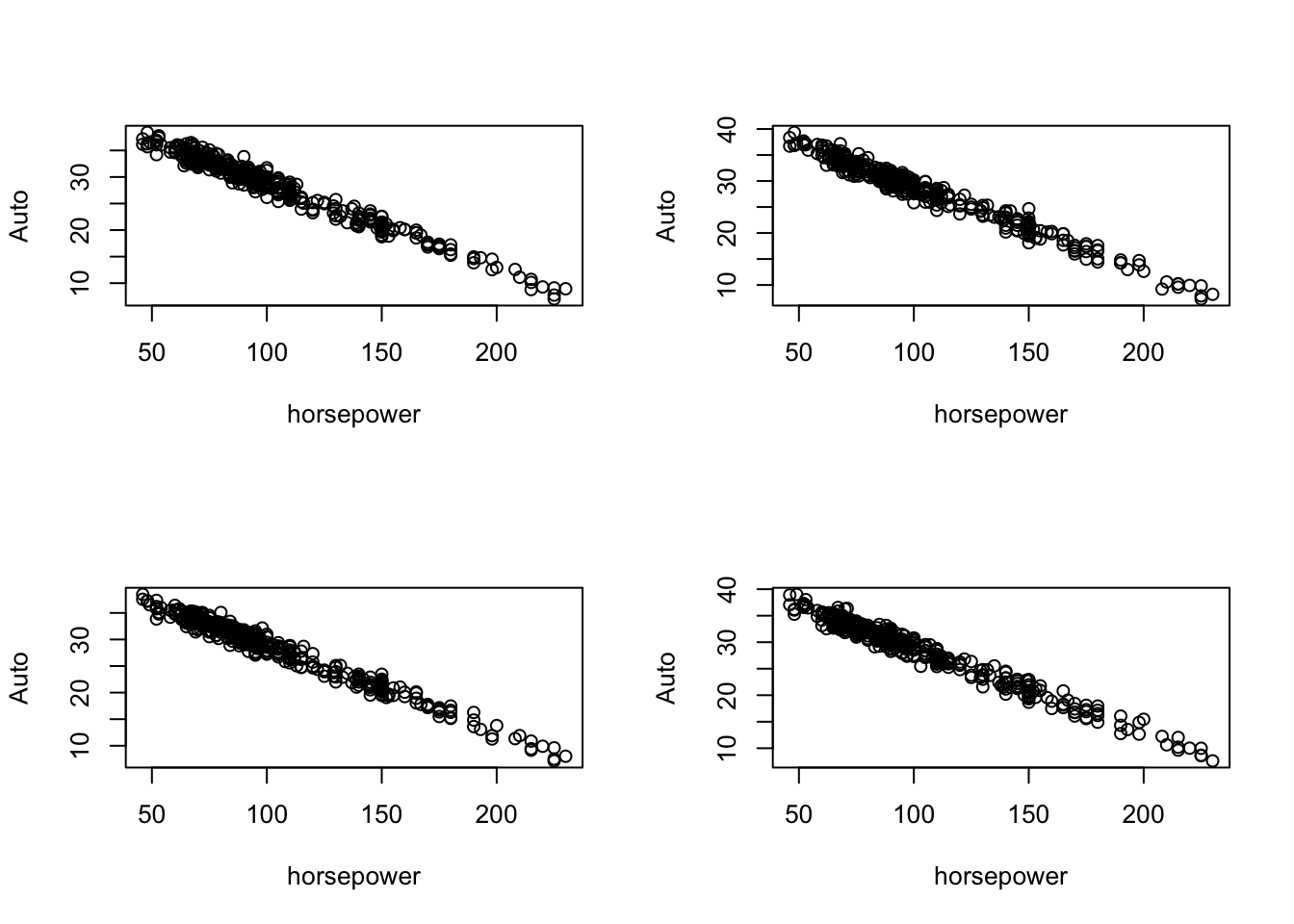 を仮定してみる.下記ではこのモデルに従って392個のYを4セット発生させ,それぞれ散布図を描いている.すなわち,実際の(horsepower, mpg)データは何セットか発生させた内のひとつの可能性として得られたものであると想定しているのである.